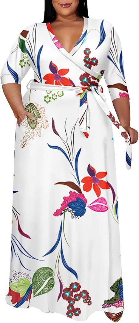 Runwind Plus Size Dress for Women - 3/4 Sleeve V Neck Printing Maxi Dresses for Women «__XL-6XL«__