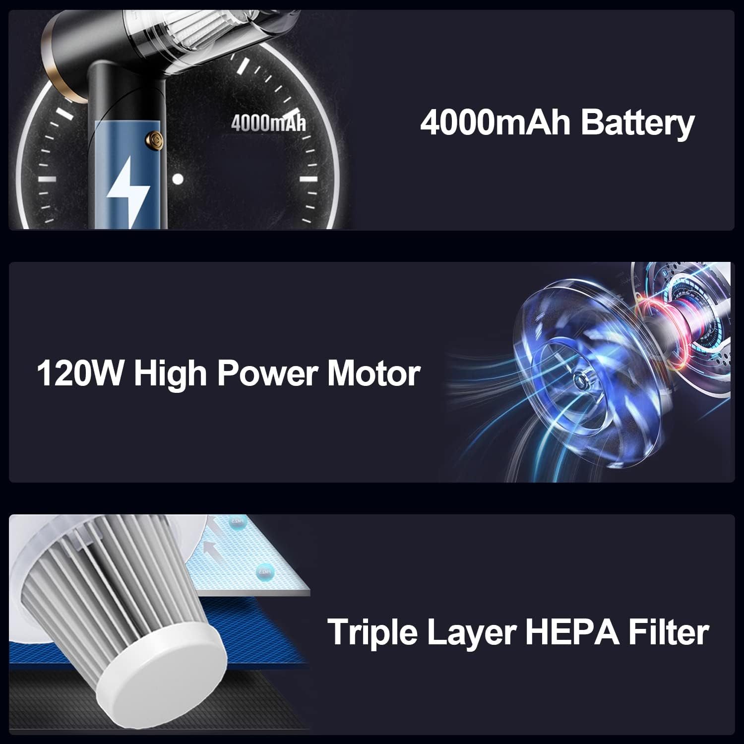 • Cordless and Rechargeable: This rechargeable handheld car vacuum cleaner adopts 4000mAh battery, it can be can quickly fully charge in 3-4 hours with 5V/2A adapter and can be used for half an hour. The cordless design allows you to take away and easy to use to clean in car, at home and office.