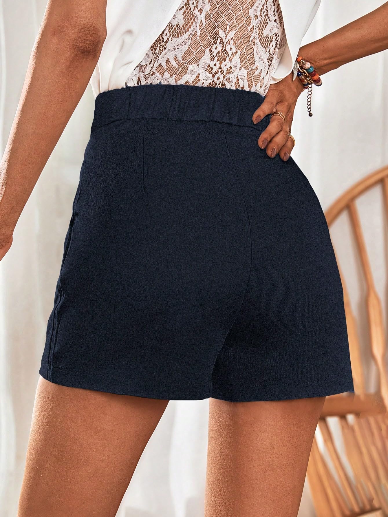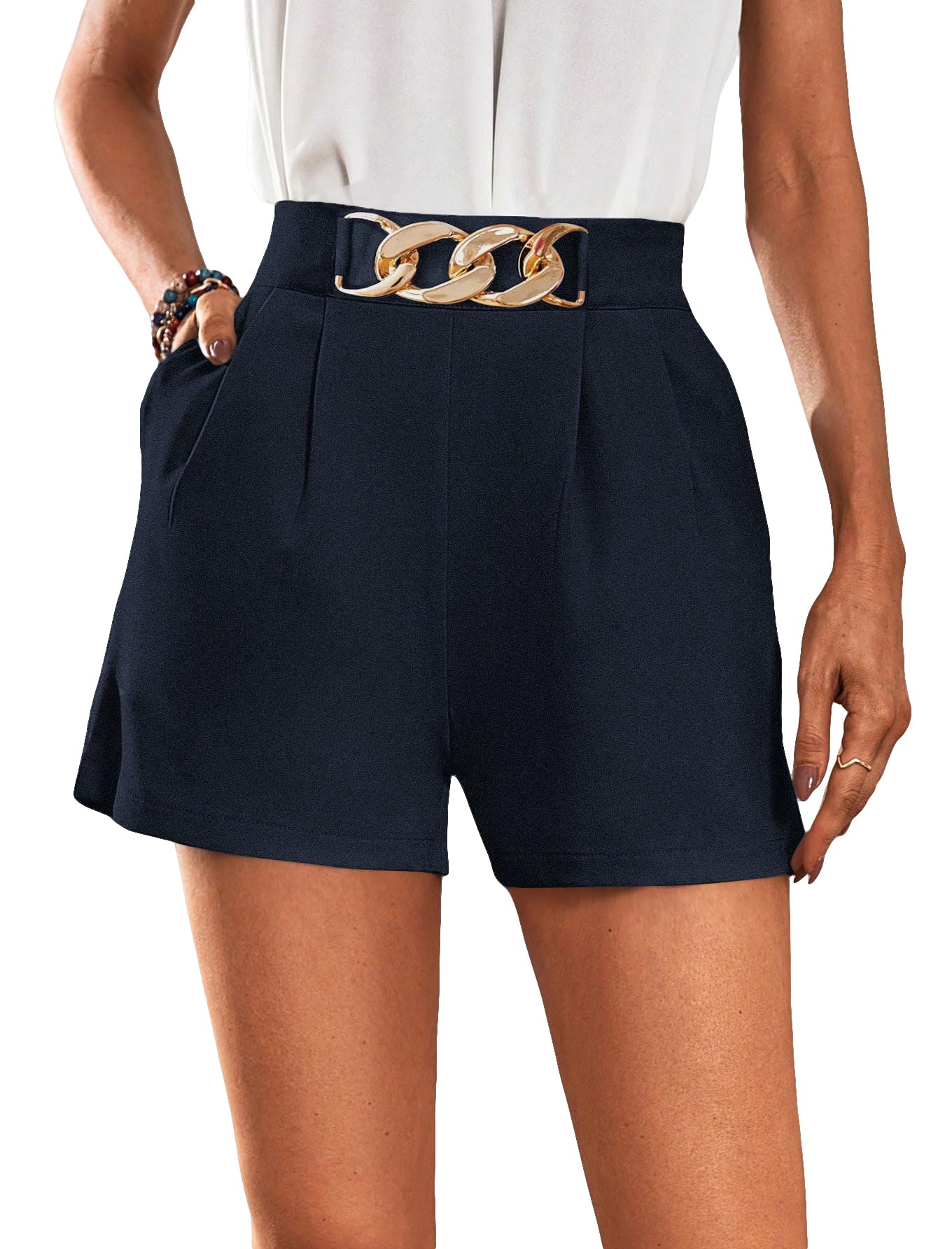 • Chain Detail High Waist Zip Up Pleated Straight Leg Summer Shorts with Pockets