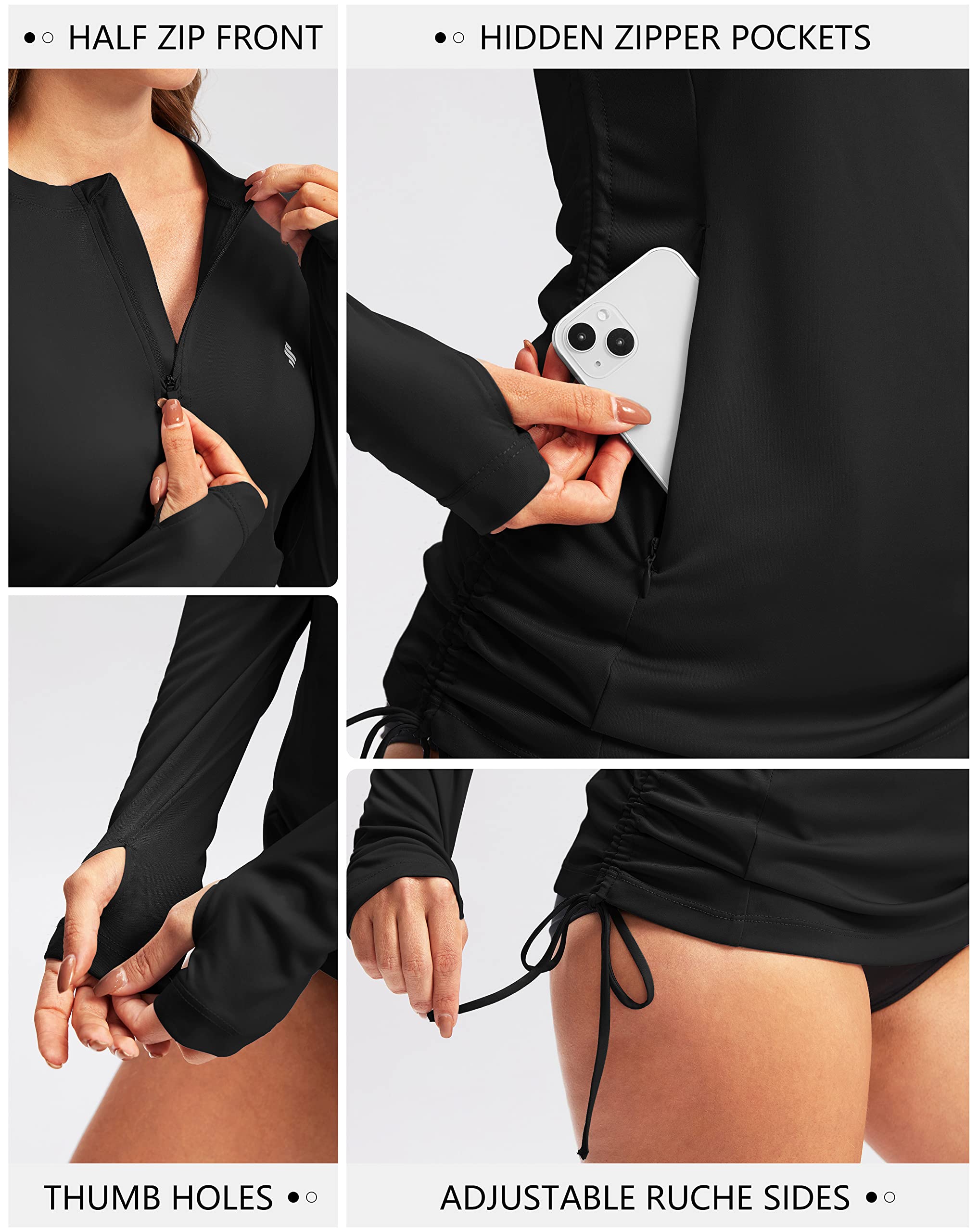 • Thumb Holes & Zipper Closure: Our women's swim shirt have thumb holes to keep the long sleeves in place and protect more of your hands.The front 1/4 zip makes it easy to put on and take off, while also allowing you to show off your perfect body.