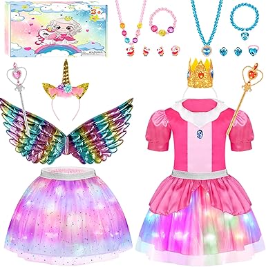 Toddlers Light Up Princess Dress Up Clothes for Little Girls 3-6, Unicorn & Peach Kids Dress Up Princess Costume with Tutu, Wing, Play Jewelry, Kid Pretend Play Princess Toys Gift for Girls Toddler