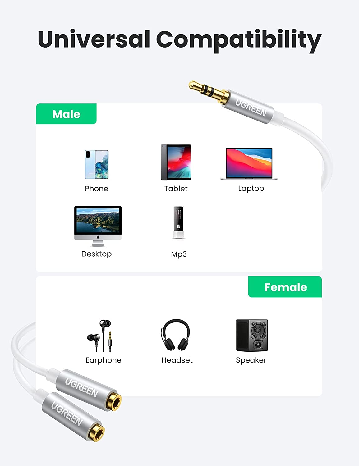 • Audio Sharing: UGREEN audio splitter allows dual headphones/speakers connected to most devices with 3.5mm auxiliary port (AUX), like MP3 player, smartphone, tablet, computer etc, which is a great solution to share cool music, movies and games with your families and friends.