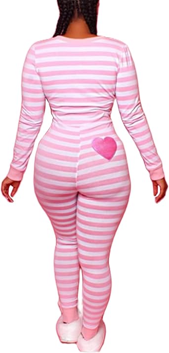 Women Sexy Bodycon Onesie Pajama Heart Print Long Sleeve Button V Neck Jumpsuit One Piece Romper Valentines Sleepwear