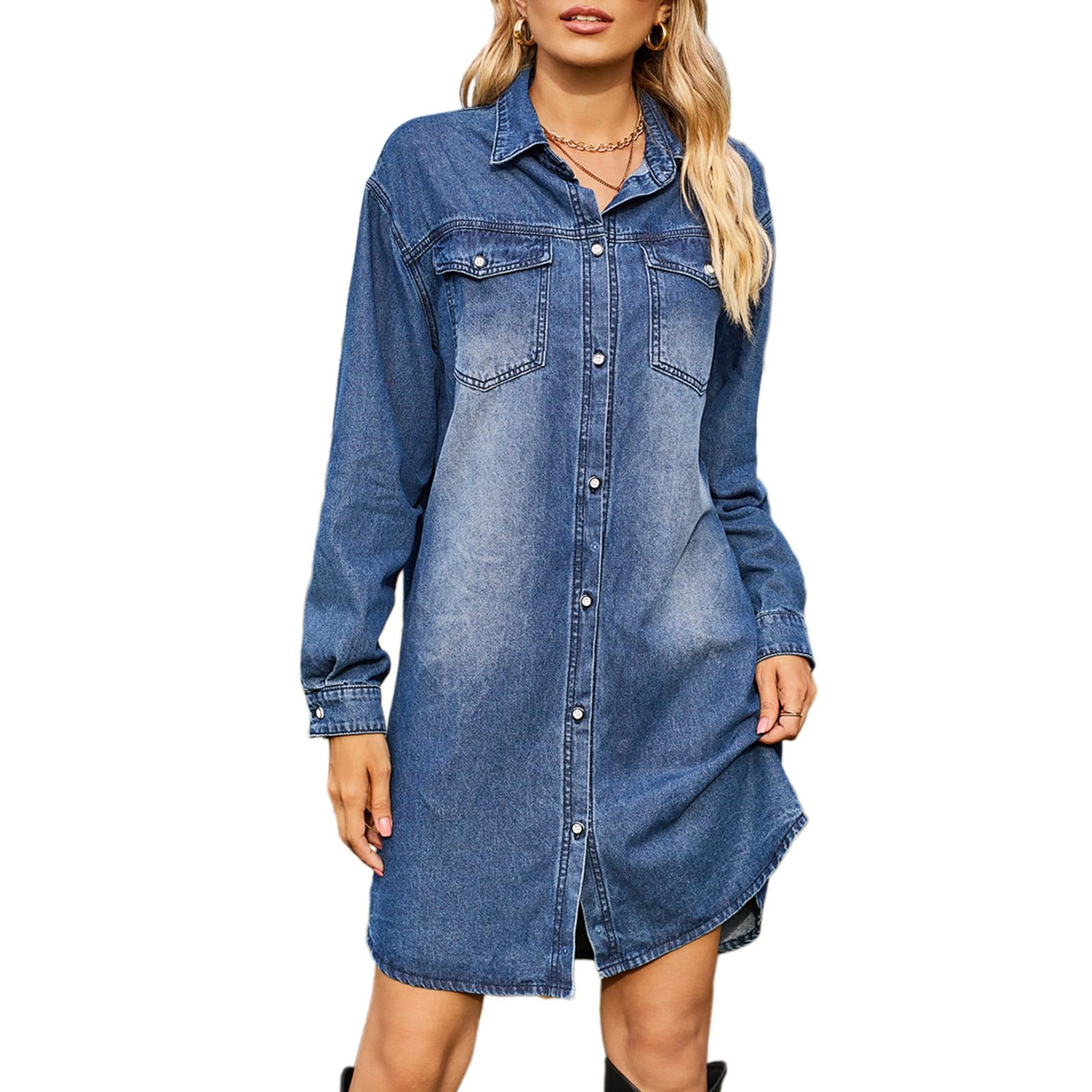 Womens Denim Shirt Dresses Long Sleeve Vintage Distressed Button Down Casual Jean Dress with Pockets B-Dark Blue M