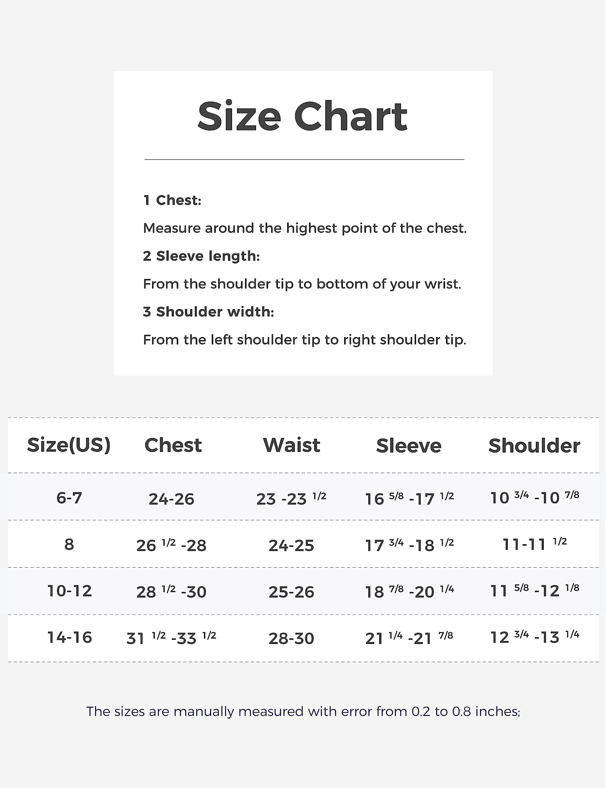 US 10-12 for age 10-11Y: Length 24.41" Chest 40.16" Hem 40.16" Sleeve 30.51"