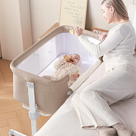 Larex Baby Bassinet, 3 in 1 Bedside Bassinet for Baby, Portable Crib with Comfy Mattress and Wheels, 7 Height Adjustable Easy Folding Bassinet Bedside Sleeper for Newborn Khaki
