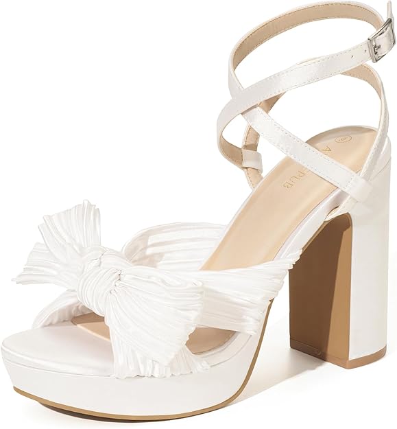 ALICEPUB Women's Bow Knot Heeled Sandals Platform Chunky Heels 4 Inch Block High Heels Open Toe Heels Wedding Bridal Heels Comfortable Dress Shoes