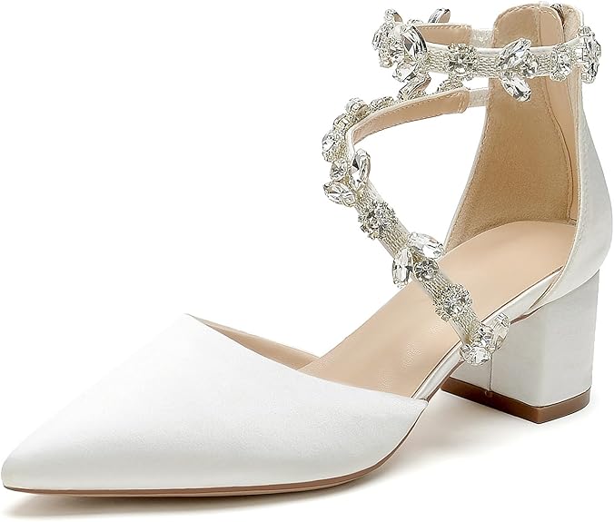 Hyinlays Women's Closed Pointed Toe Block Heel Satin Crystal Wedding Pump Shoes Chunky Low Heel Bridal Prom Heels Sandals
