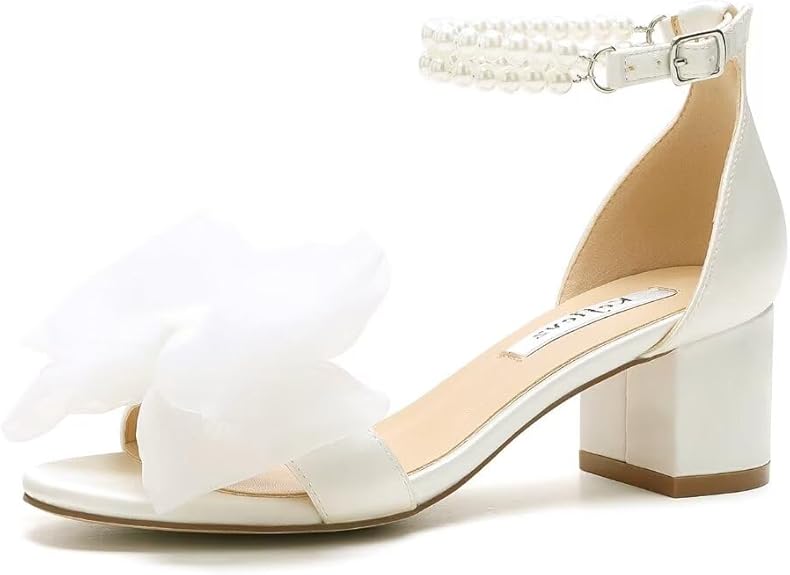 Pearl Heels Wedding Sandals with Bow Block Heel Wedding Shoes for Bride Bridal Heels