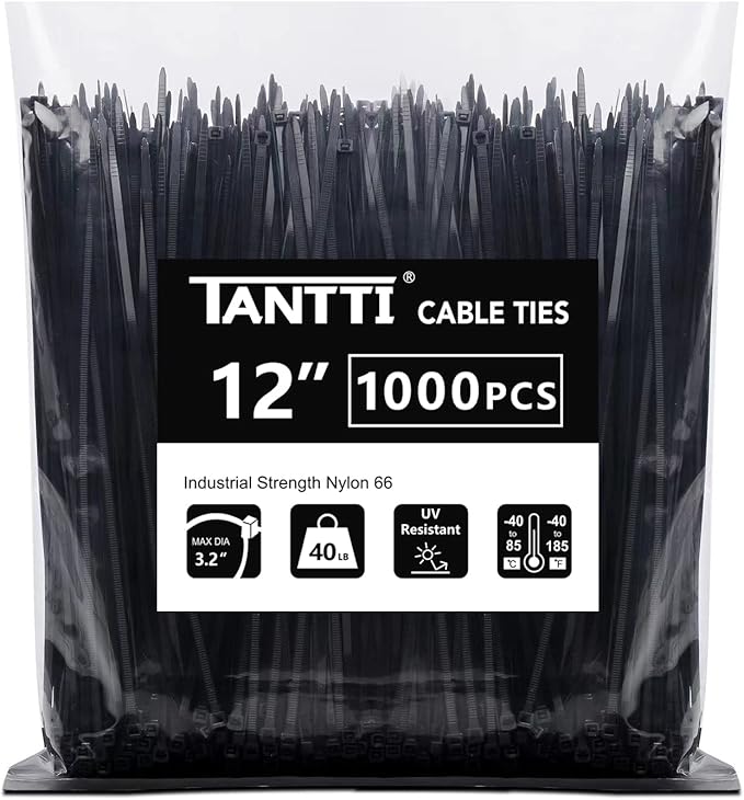 Zip Ties 12 inch, Black Zip Ties 1000 pack, 40lb, Cable Ties, Self-locking Wire ties for indoor and outdoor use, by Tantti