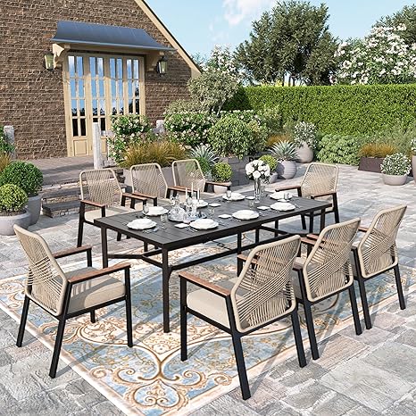 HERA'S HOUSE 9 Pieces Patio Dining Sets, Patio Table and Chairs for 8, 8 x Cushioned Woven Rattan Patio Chairs and 1 x 83 Large Rectangle Dining Table, Outdoor Rattan Dining Table Set for Lawn Garden