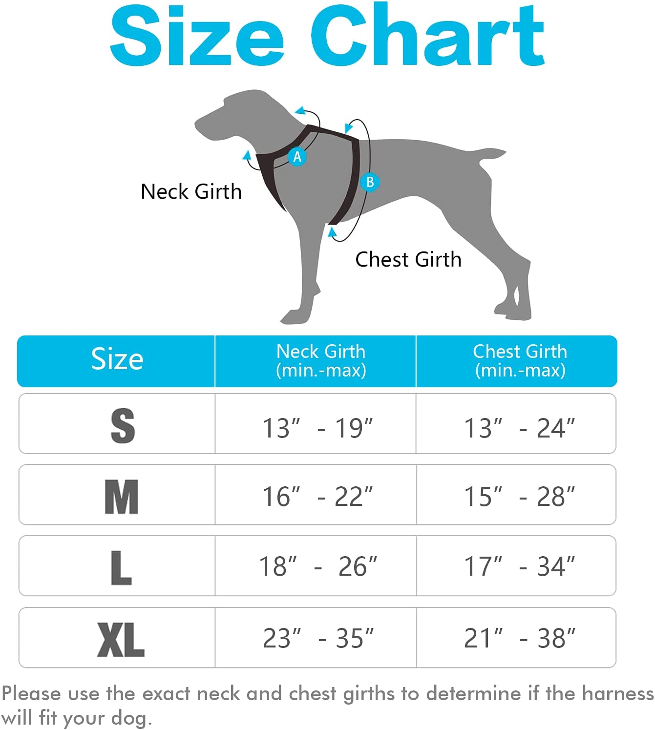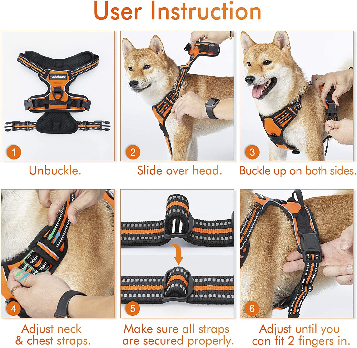 • Fully Adjustable - This adjustable harness features 4 easy adjusting straps around the body. You can use its 2 neck straps and 2 chest straps to create a perfect fit for your dog with some room of growth. No worries about slipping out or choking
