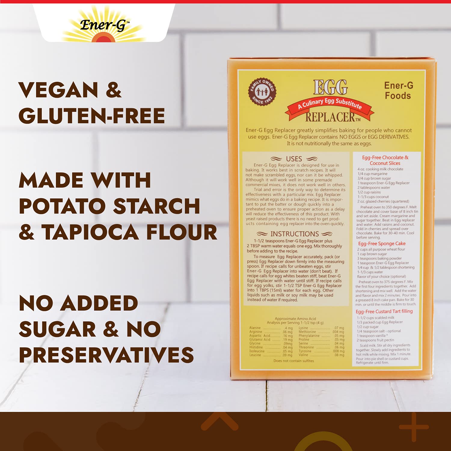 Ener-G Vegan Egg Replacer for baking mimics what eggs do in recipes to bind baked food together, but itβs completely egg-free. Gluten free, made from potato starch and tapioca starch flour. Perfect for those with food allergies or restrictions, or just watching their nutritional intake.