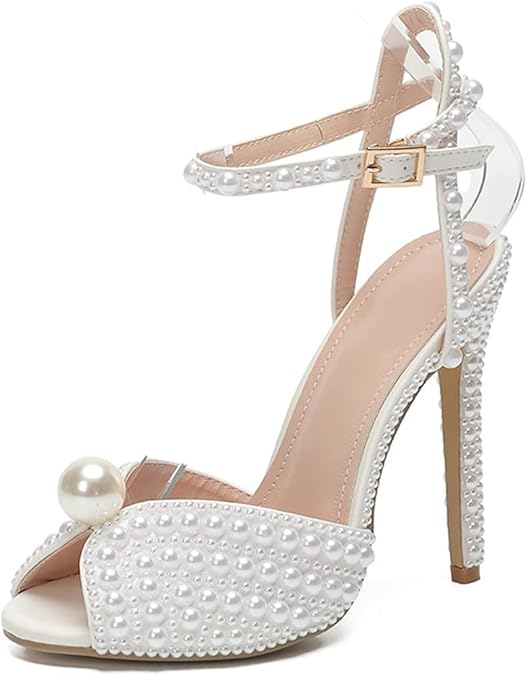 YIYA White Pearl Sandals for Women Open Toe Chunky High Heel Pump Ankle Strap Shoes Bride Wedding Party Shoes