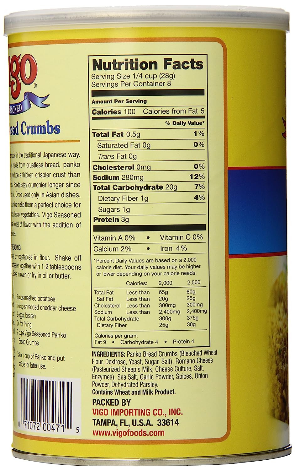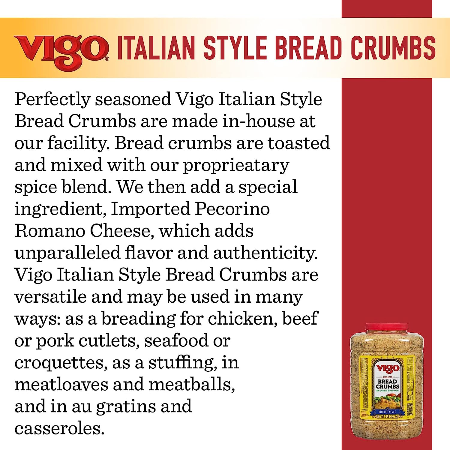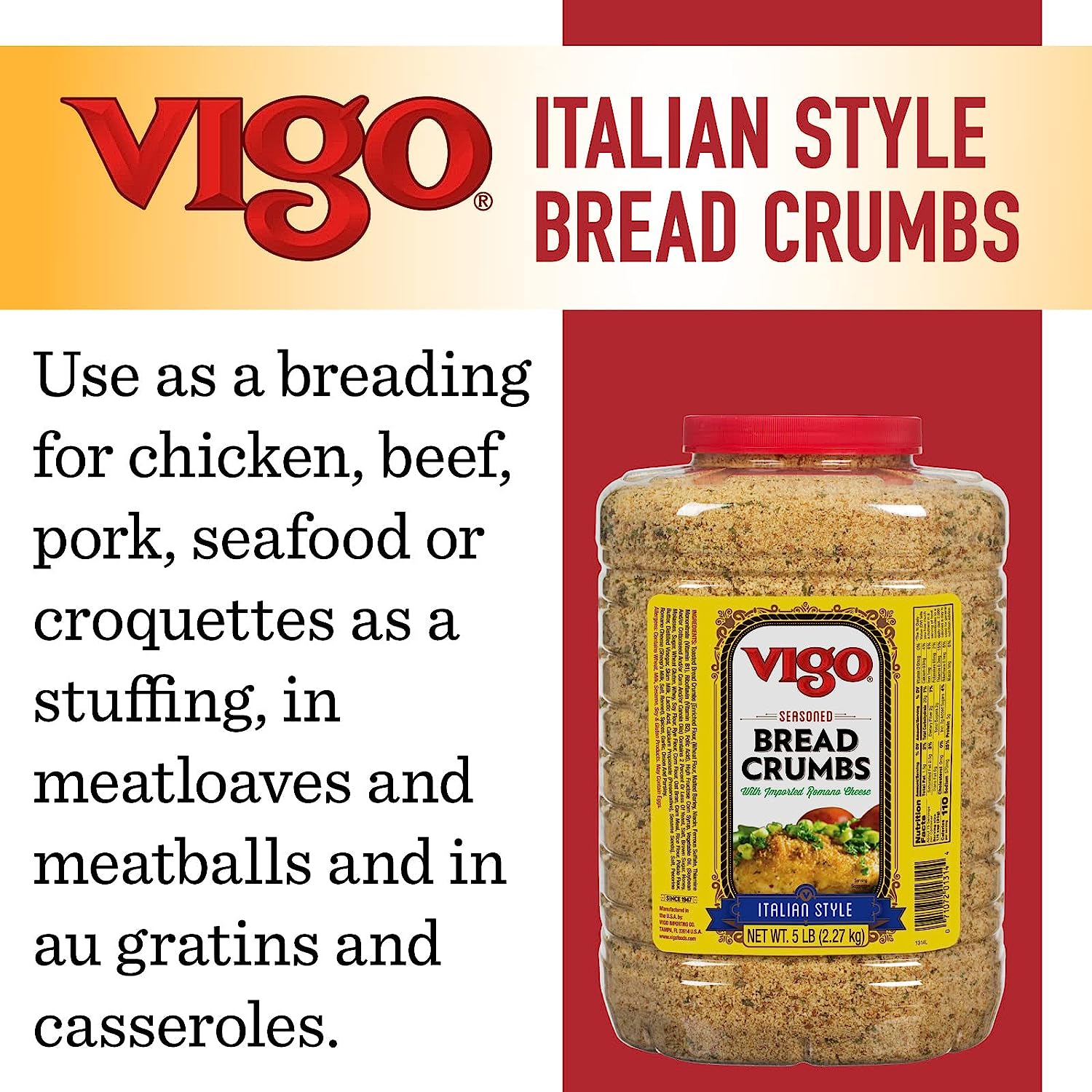 Vigo Italian Bread Crumbs are the combination of our Golden Toasted Bread Crumbs, a traditional blend of spices, and freshly ground Romano cheese. Made from an old family recipe, Vigo Italian Seasoned Bread Crumbs may be used in many ways: as a breading for chicken, beef or pork cutlets, seafood or croquettes, as a stuffing, in meatloaves and meatballs, and in au gratins and casseroles.