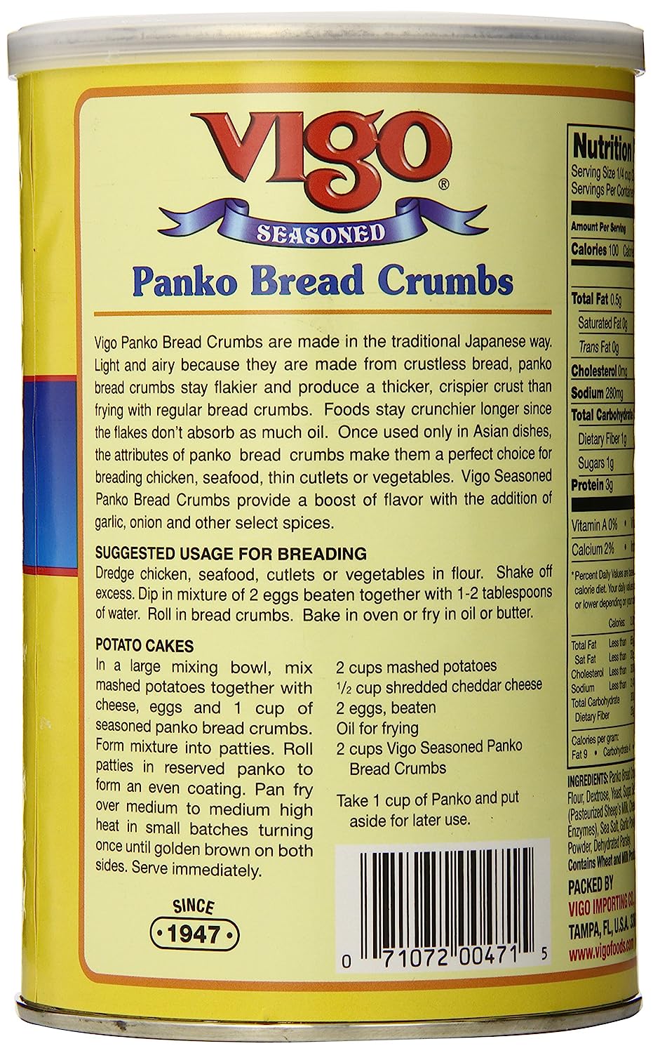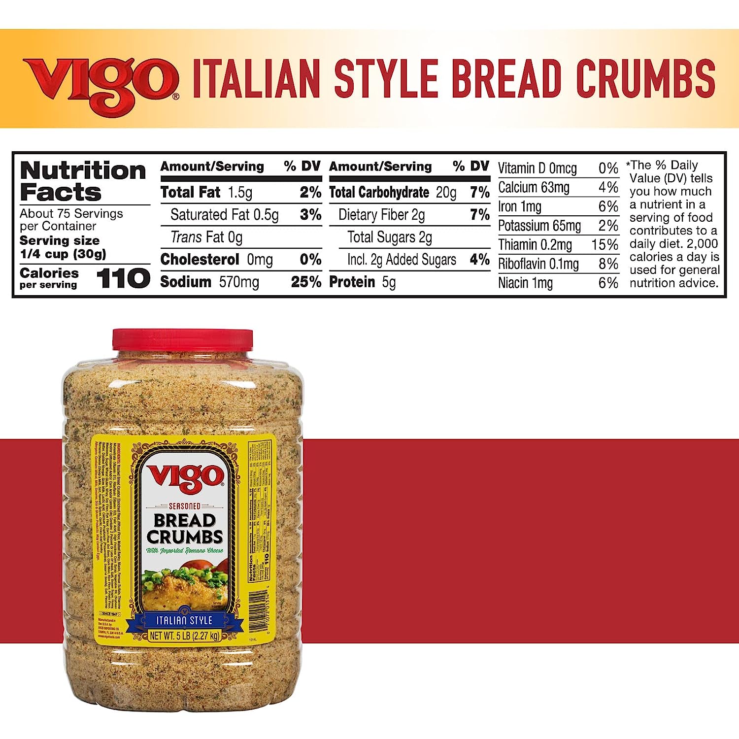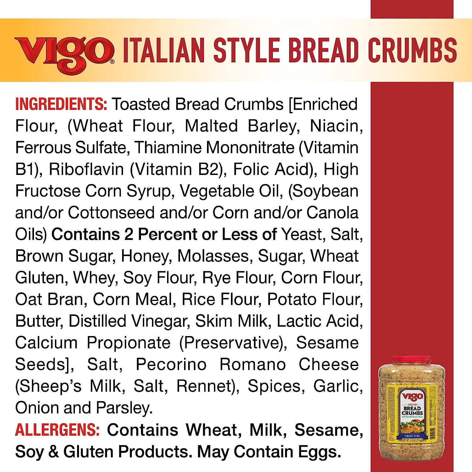Vigo Italian Bread Crumbs are the combination of our Golden Toasted Bread Crumbs, a traditional blend of spices, and freshly ground Romano cheese. Made from an old family recipe, Vigo Italian Seasoned Bread Crumbs may be used in many ways: as a breading for chicken, beef or pork cutlets, seafood or croquettes, as a stuffing, in meatloaves and meatballs, and in au gratins and casseroles.