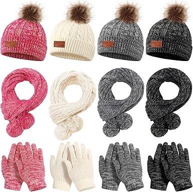 Liitrsh 12 Pcs Kids Winter Knitted Kids Winter Beanie Hat Scarf Gloves Set, Warm Boy Girl Pom Hat Scarf Gloves for 5-12 Years