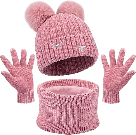 MAYLISACC 3 Pack Kids Hat Scarf Gloves Sets Winter Warm Pom Beanie Hat Fleece Lined Neck Warmer for Girls Boys 2-10