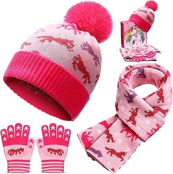 Unicorn Girls Winter Hat Scarf Gloves Sets Kids Beanie Hat with Pom Winter Knit Neck Mittens for Girls Toddlers