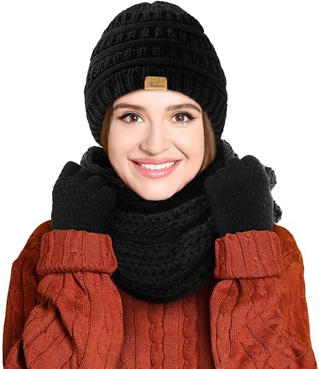 Winter Beanie Hat Scarf Gloves Set, Warm Knit Winter Hats Touchscreen Gloves Thick Neck Warmer Winter Scarf for Women
