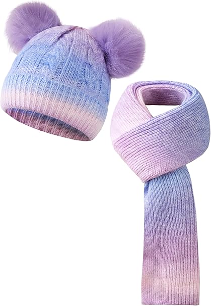 Winter Hat Scarf Set Kid Girls Knit Beanie Hat with Double Pom Knitted Warmer Scarf Rainbow Cold Knitting Set