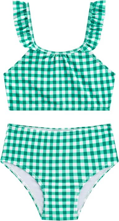 LIZENS Girls Two Piece Swimwear Green Checkered Tankini Set Cute Bathing Suits for Kids
