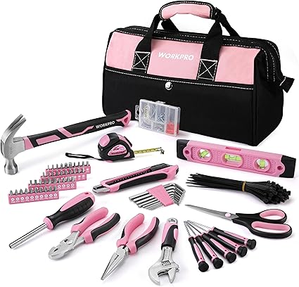 WORKPRO Pink Tool Kit, 263-Piece Home Repairing Tool Set with Wide Mouth Open Storage Bag, Household Tool Kit - Pink Ribbon