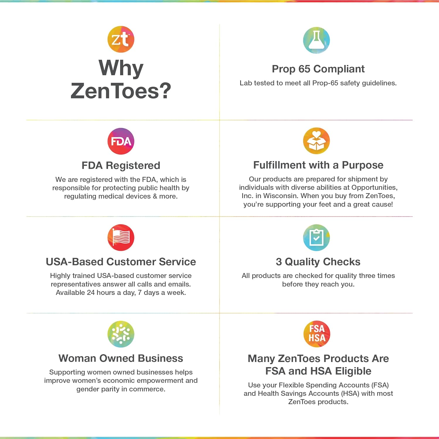 • Based in the USA - At ZenToes, we aim to provide relief for common painful foot conditions. As a small, woman-owned business based in Wisconsin, we are proud to provide comfort to millions of happy feet. Get back to your active lifestyle, with ZenToes!