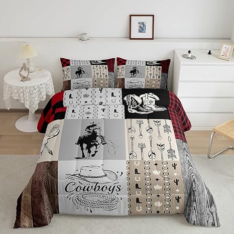 Erosebridal Western Cowboy Bedding Set Wild West Bull Horse Queen Comforter Set for Boys Teen Men Red Black Buffalo Plaid Check Bed Comforter Sets Country Farmhouse Boho Arrows Quilts Brown Grey