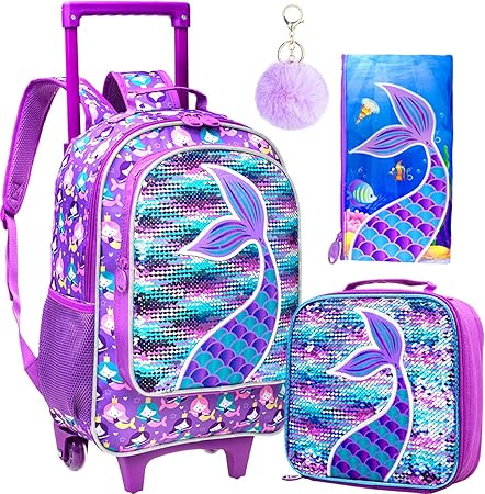 gxtvo Rolling Backpack for Girls, Roller Wheels Kids Bookbag - Wheeled Suitcase Elementary Sequin School Bag - 3PCS Mermaid