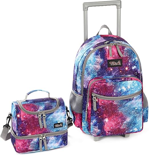 Tilami Rolling Backpack 18 inch Double Handle with Lunch Bag Wheeled Kids Backpack for Girls and Boys, Galaxy