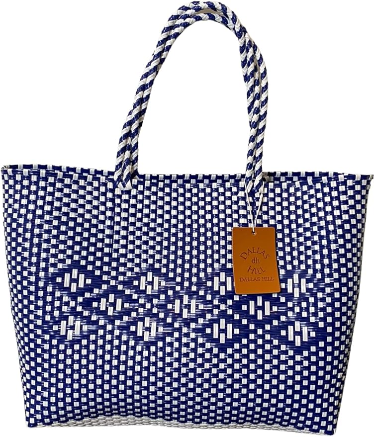 Dallas Hill Designs Handwoven Super Tote Bag for Women | Recycled Plastic Shoulder Purse | Summer Beach, Pool, and Travel Handbag (Navy & White)