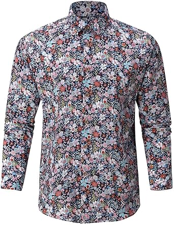 Men's Hipster Slim Fit Long Sleeve Button Up Dress Shirts Lapel Casual Plus Size Hawaiian Floral Beach Shirt Tops