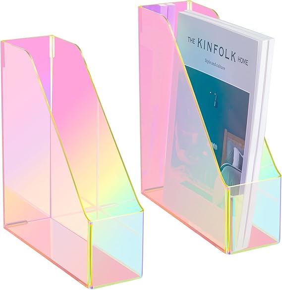 2 Pcs Iridescent Vertical Magazine File Holder Acrylic Magazine Holder Storage Magazine Organizer Plastic Clear Acrylic Magazine Rack for Office Classroom Home Document Paper Book Collection