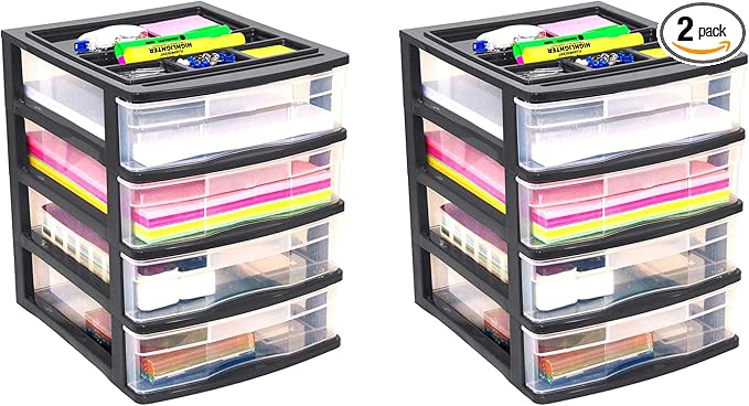 Gracious Living 4 Drawer Desktop & Countertop Organizer w/Organization Lid for Craft Storage, Office Supplies & School Supplies, Black/Clear (2 Pack)