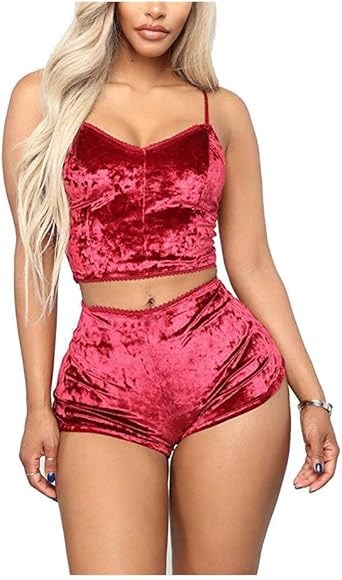 AWIBMK Women's Velvet 2 Piece Outfit Spaghetti Strap Sleeveless Crop Top Camisole and Shorts Pajamas Set Sleepwear Nightwear