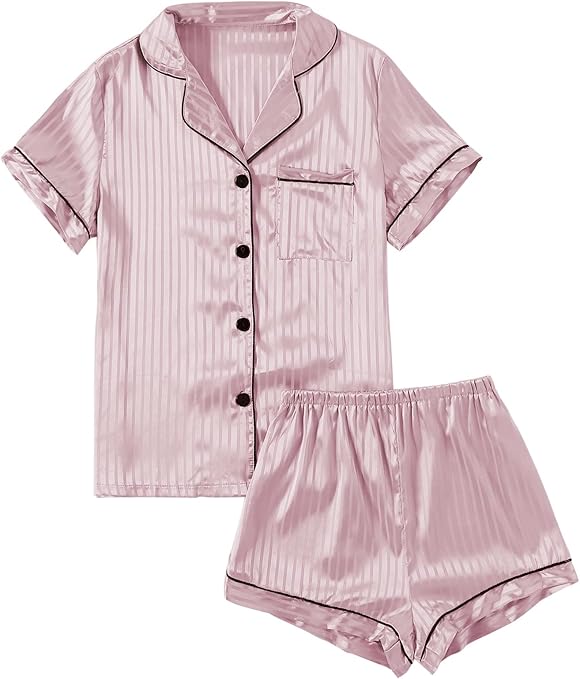 LYANER Women's Striped Silky Satin Pajamas Short Sleeve Top with Shorts Sleepwear PJ Set