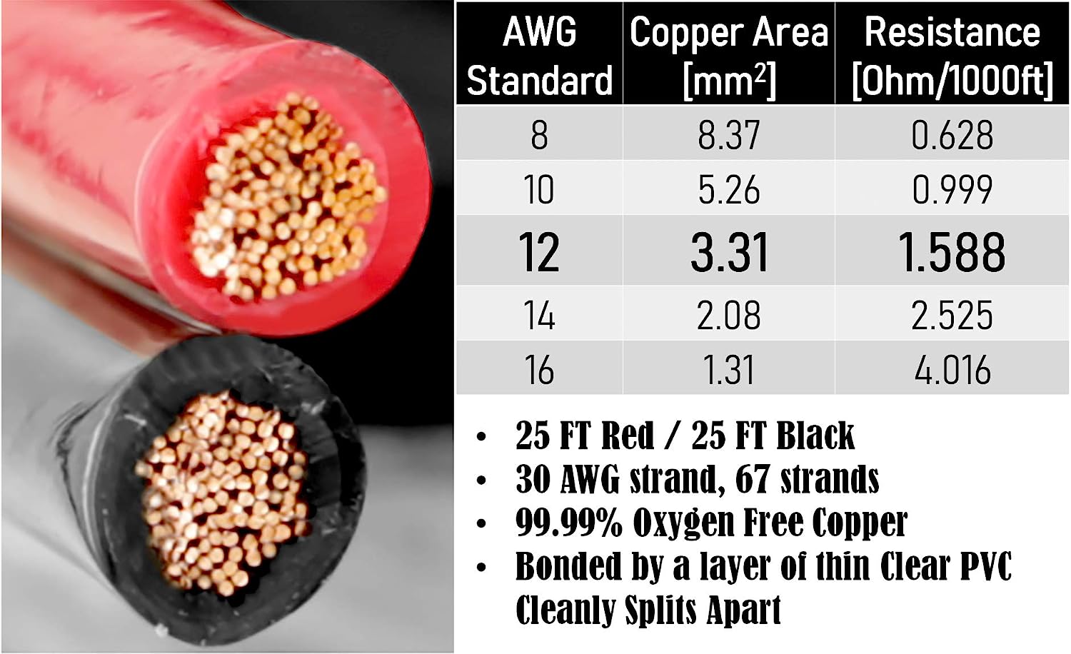• True 12 Gauge wire | 2 conductors, 67 Strands per conductor. 0.25 mm diameter per strand