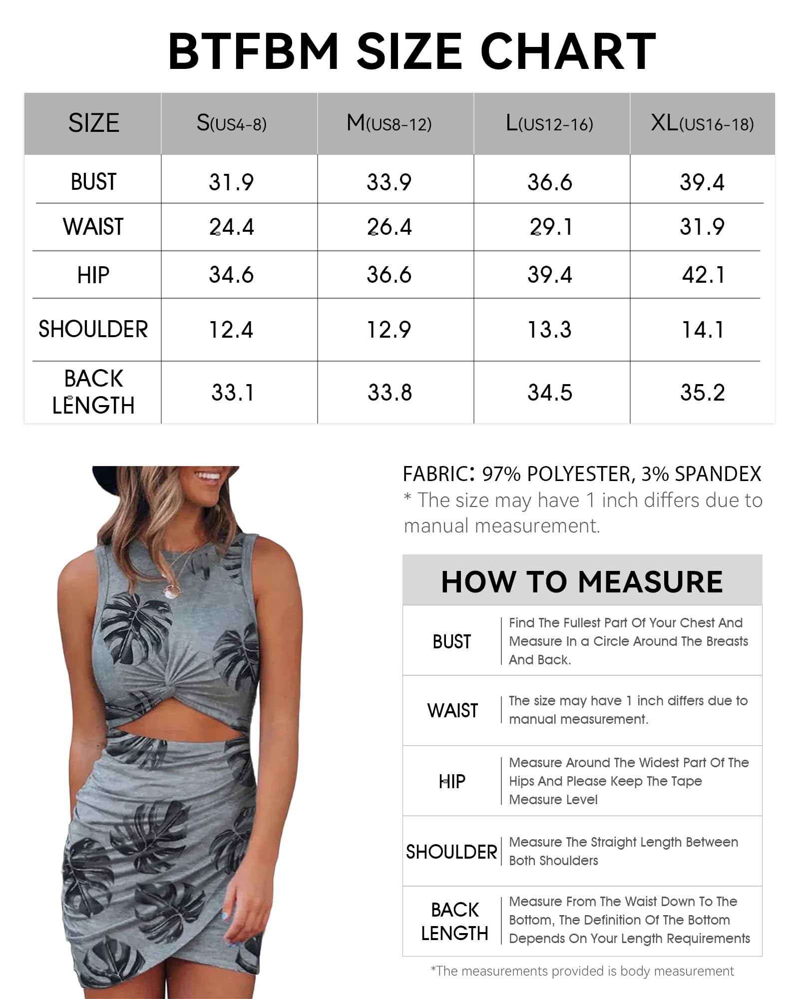 BTFBM Women 2024 Summer Sleeveless Casual Crewneck Bodycon Tank Dress Cutout Twist Slim Wrap Club Party Evening Dresses(Leaf Print Grey, X-Large)