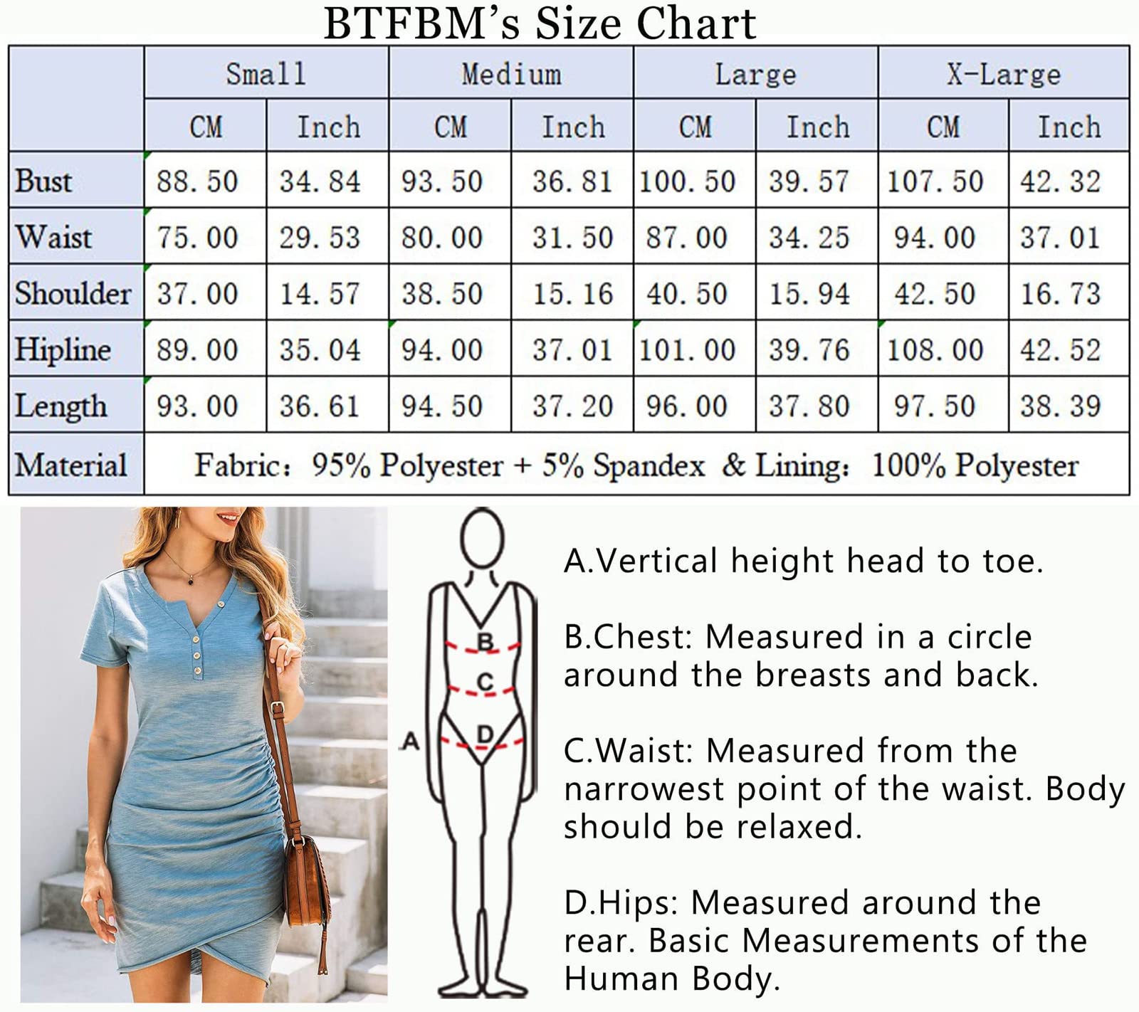 Details: The simplest design create the most fashionable you, fashion and chic. Brand: BTFBM Item Type: Above knee/Mini dress Style: Casual Feature:Ruched/Wrap Front Pattern: Solid Closure Type: Pullover Neckline: Round Neck Sleeve Type: Sleeveless/Short Sleeve Fabric: Stretch&Skin-friendly Season: Summer&Spring Laundry Guide: Hand Wash and Machine Wash under 30℃, No bleach Size Chart: Sleeveless style US S: Bust 33.86"----Waist 28.35"----Length 36.61" US M: Bust 35.83"----Waist 30.31"----Length 37.09" US L: Bust 38.19"----Waist 32.68"----Length 37.56" US XL: Bust 40.55"----Waist 35.04"----Length 38.03" Short sleeve style: US S: Bust 33.86"----Waist 28.35"----Length 36.61"---Sleeve Length 6.69’’ US M: Bust 35.83"----Waist 30.31"----Length 37.09"---Sleeve Length 6.89’’ US L: Bust 38.19"----Waist 32.68"----Length 37.56"---Sleeve Length 7.09’’ US XL: Bust 40.55"----Waist 35.04"----Length 38.03"---Sleeve Length 7.28’’