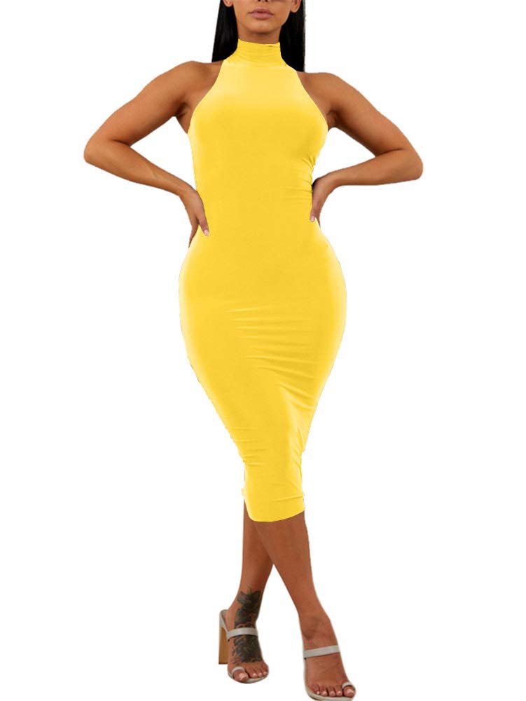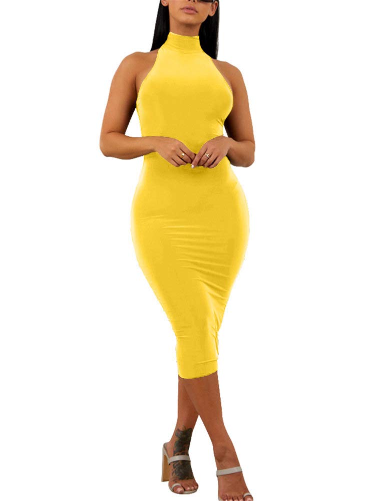 GOBLES Women's Sexy Halter High Neck Elegant Sleeveless Bodycon Midi Club Dress Yellow