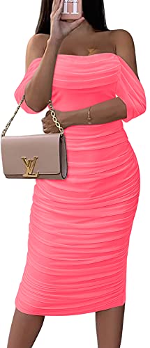 GOBLES Women's Sexy Strapless Slim Fitting Ruching Midi Cocktail Tube Dress Pink