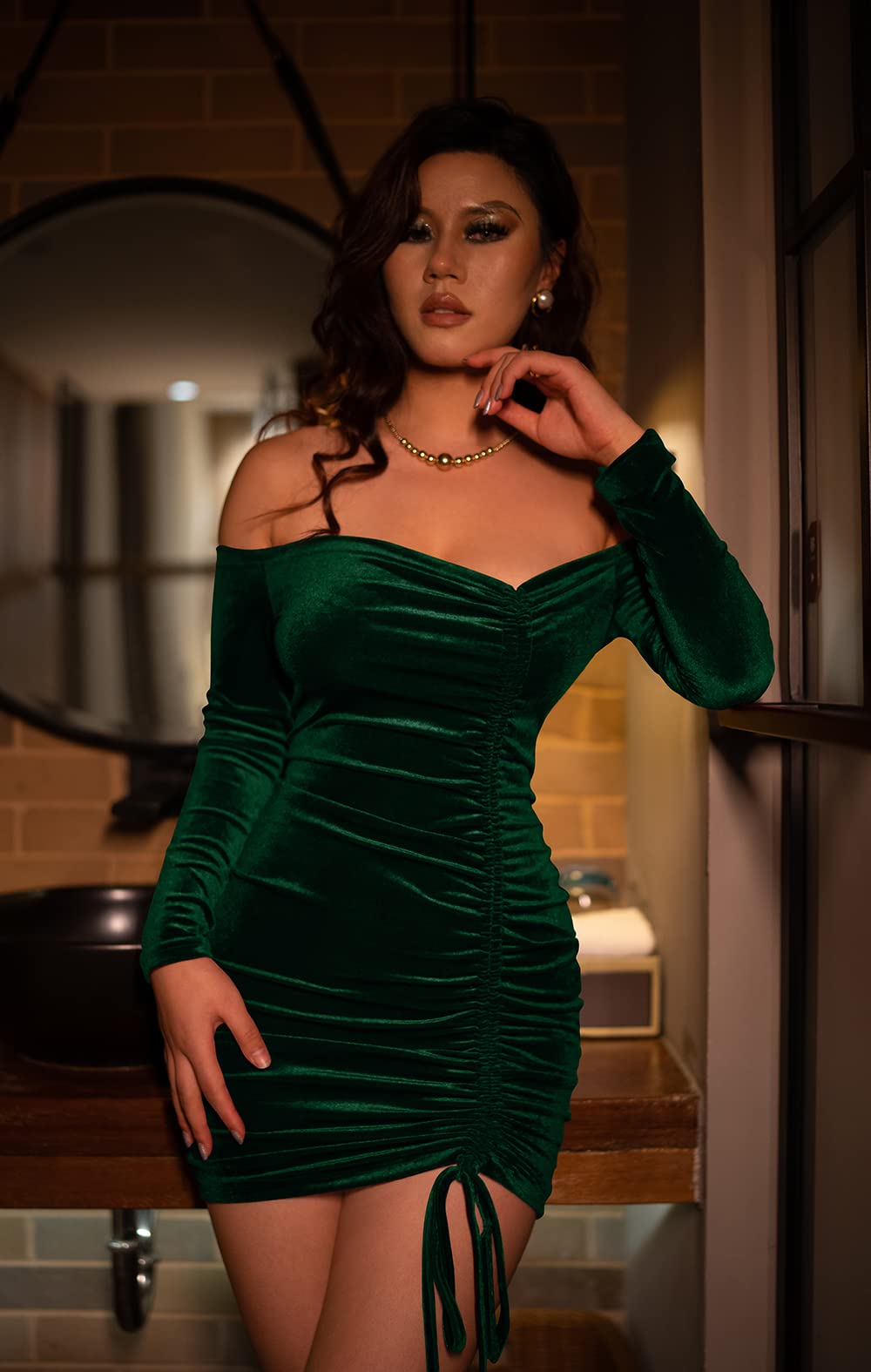 GOBLES Womens Velvet Bodycon Ruched Sexy Off Shoulder Bodycon Mini Club Dress Dark Green