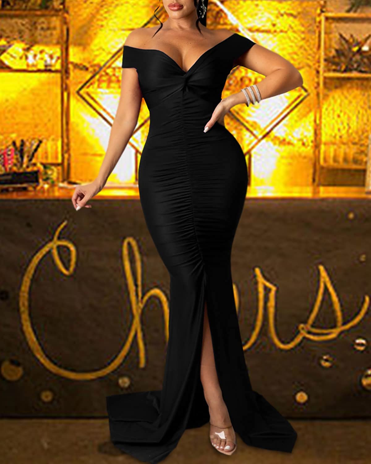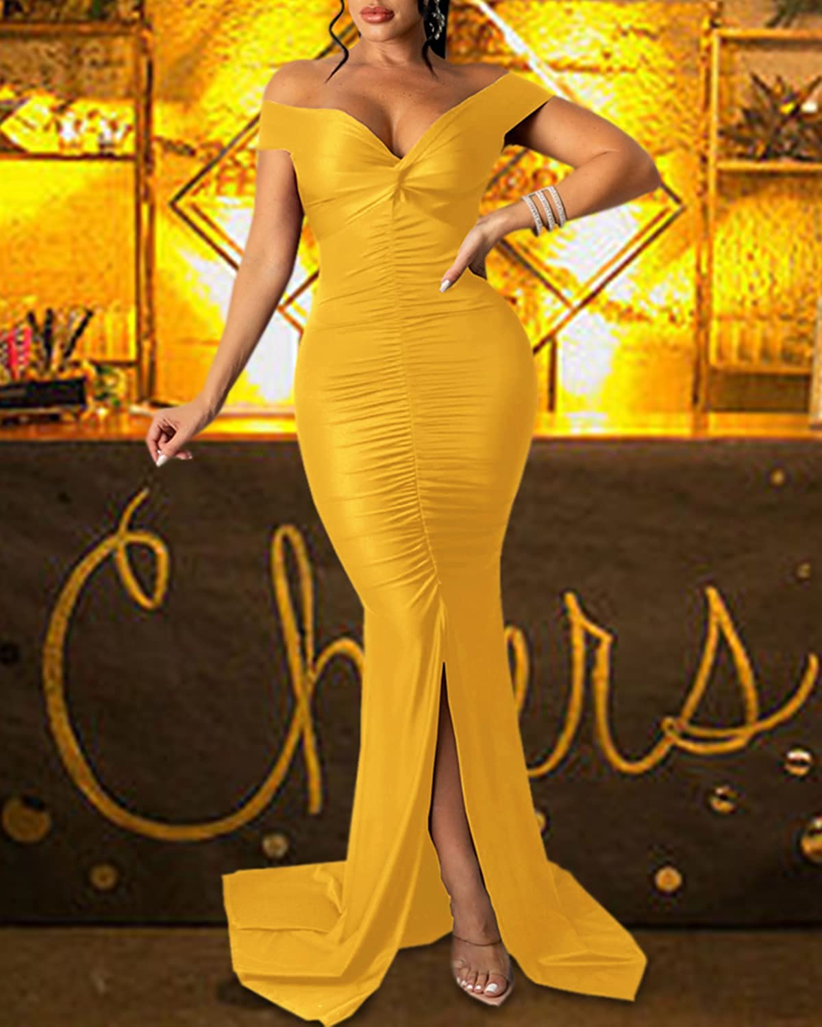 • Feature: Off Shoulder, Ruched, Solid Color, unique sexy formal dress. Exquisite tailoring can better show your charm and elegant. This evening gown dress make you shining, eye-catching and outstanding.