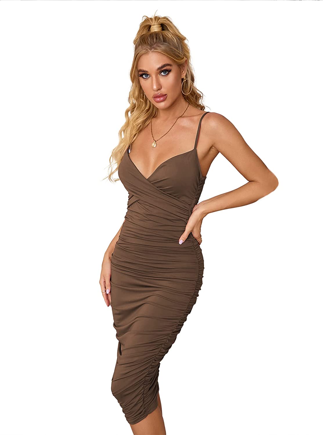 SheIn Women's Ruched Midi Bodycon Dress Sleeveless V Neck Crisscross Ribbed Knit Party Club Pencil Long Cami Dress