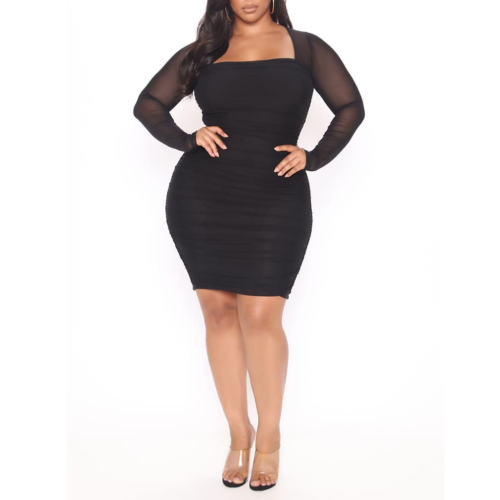 SHESEEWORLD Women's Sexy Sheer Mesh Long Sleeve Square Neck Ruched Bodycon Mini Club Dress Black