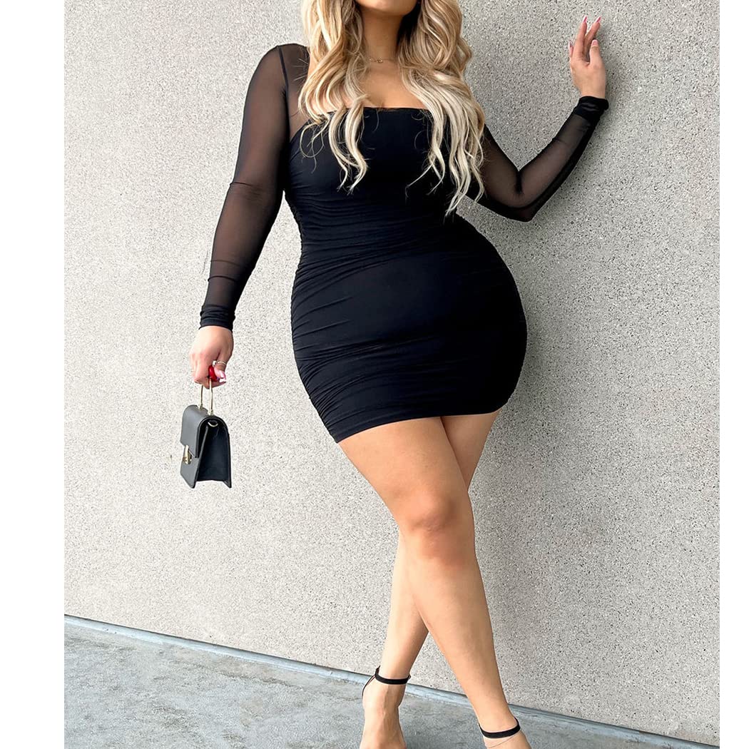 • Features:See Through Long Sleeve,Square Neck,Back Ruched,Bodycon,Back Zipper,Pencil Short Dress.