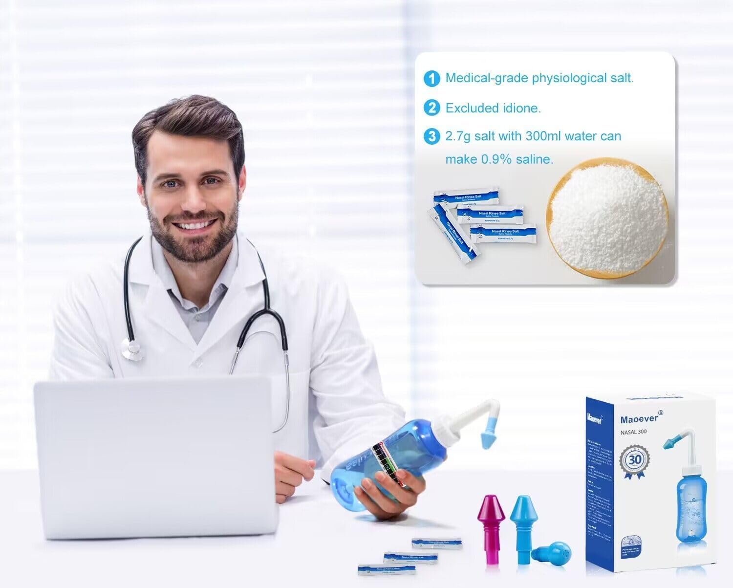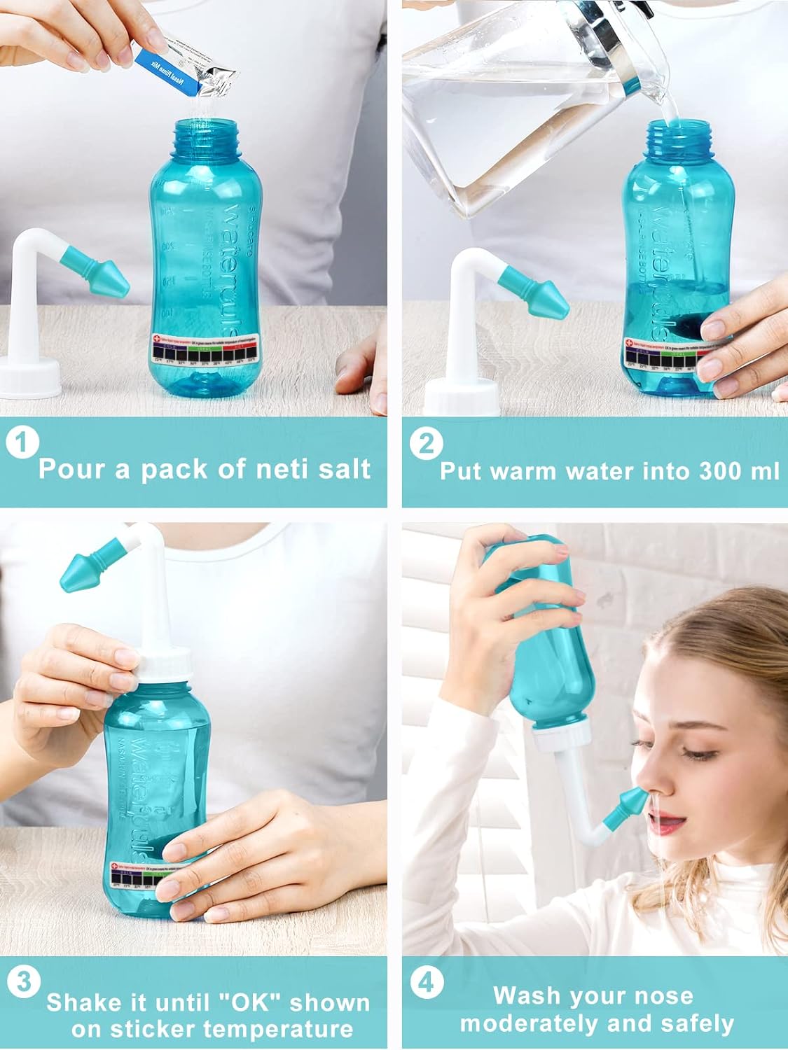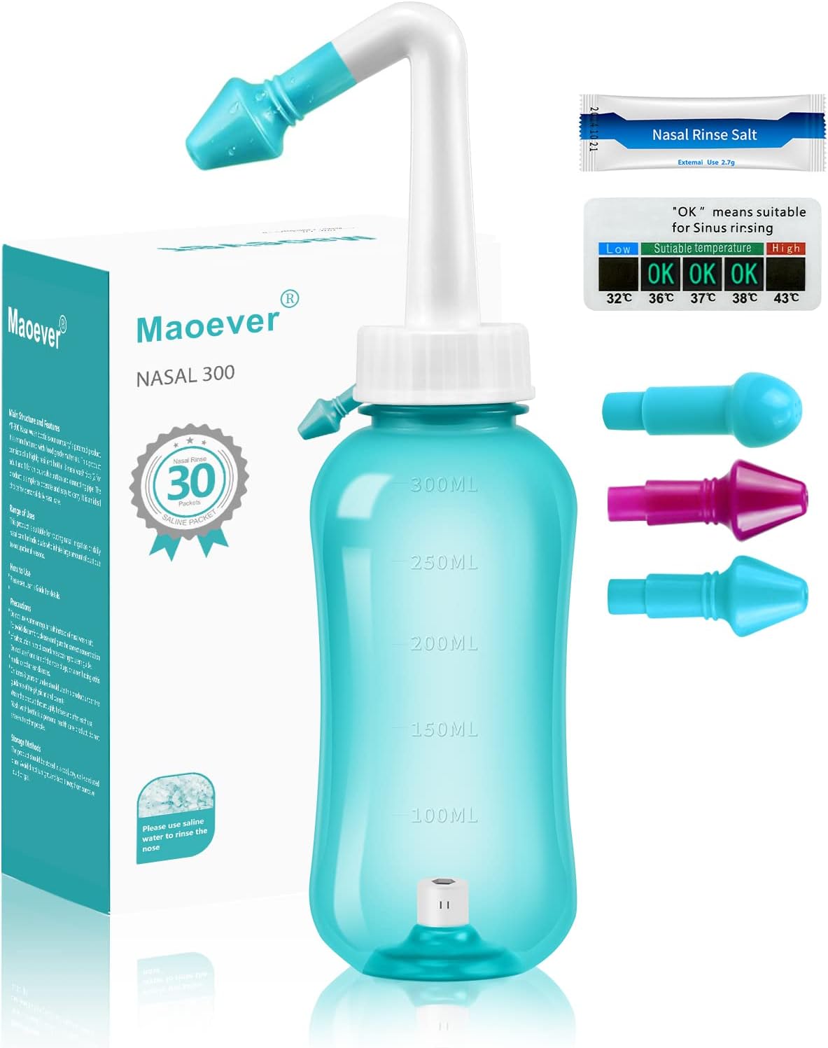 MAOEVER Neti Pot Sinus Rinse Bottle Nose Wash Cleaner Pressure Rinse Nasal Irrigation for Adult & Kid BPA Free 300 ML with 30 Nasal Wash Salt Packets and Sticker Thermometer(Blue)