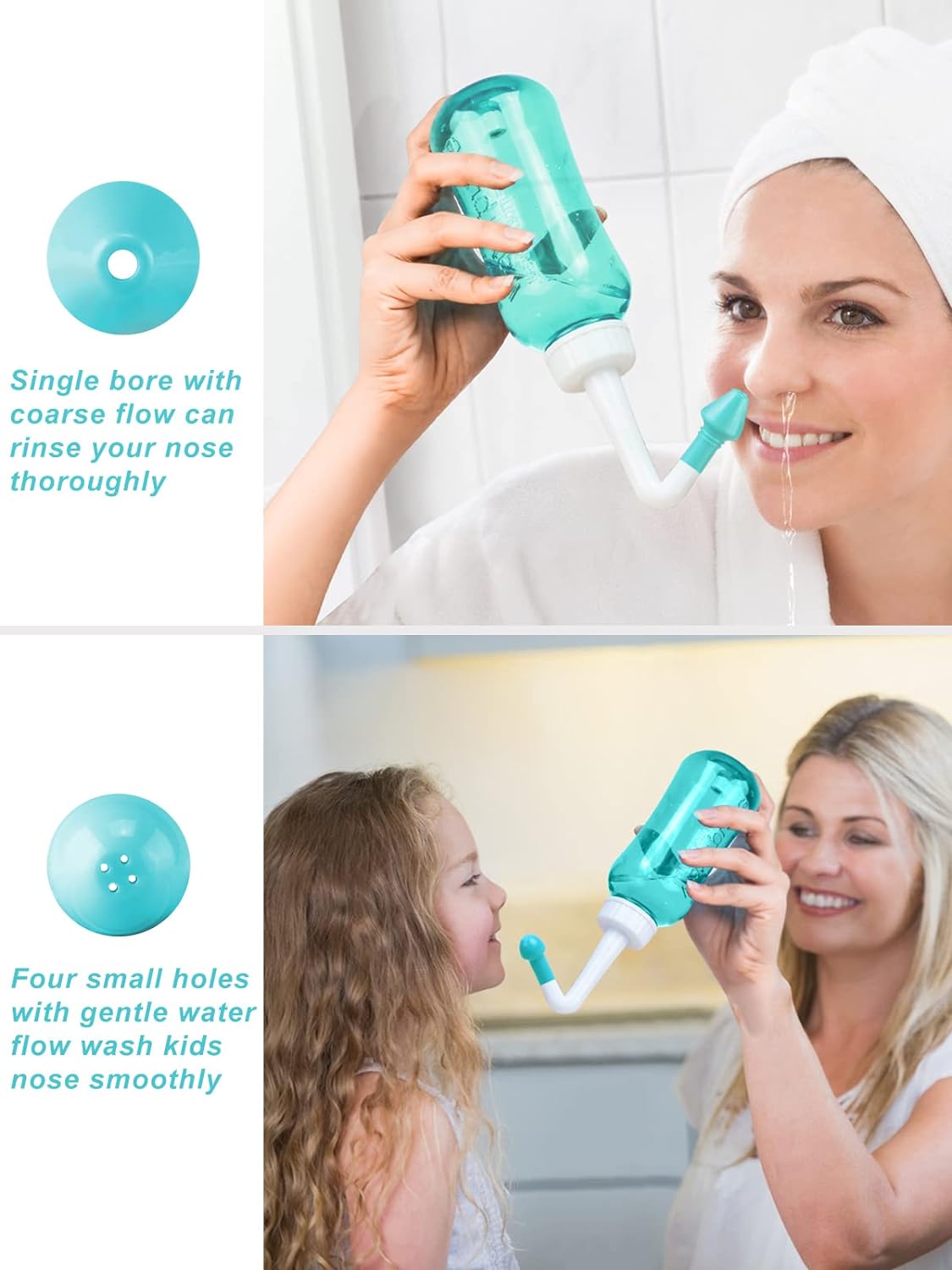 • EASY TO USE - Simply turn the neti pot upside down and press the button. You do not need to squeeze the nose cleaner. Gravity does the rest. The sinus rinse bottle squirts water in one nostril and drains out the other.