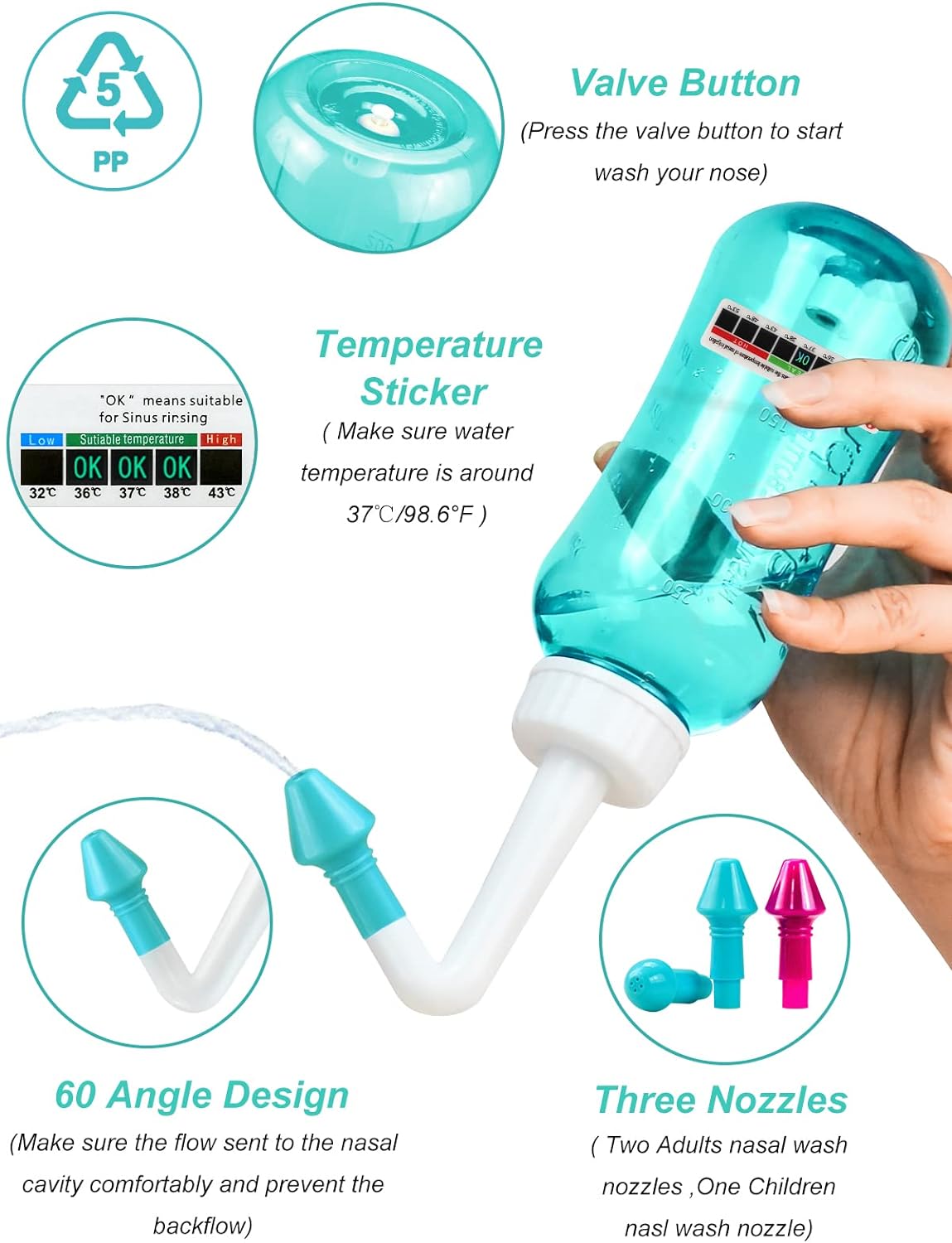 • NO LEAKAGE - Each junction of the neti pot is designed to avoid leaks. No need to worry about water is shooting out of your nose.